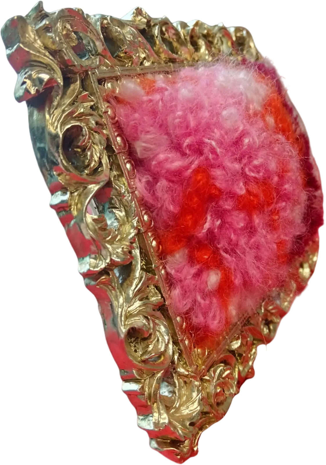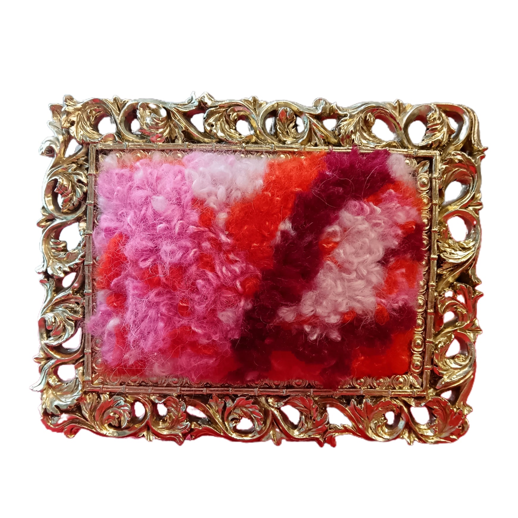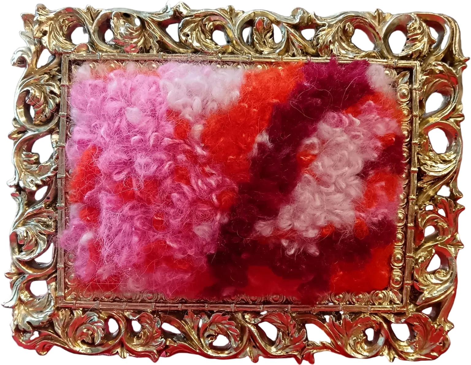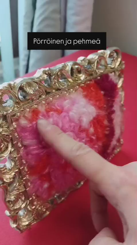 Kierrätyslangoista (akryyli) tuftaustekniikalla valmistettu taideteos on hauska katseenvangitsija kodin sisustukseen. Pehmeää ja kovaa yhdistelevä 'Arvopohja' on vuodelta 2024 ja sen on taiteillut Susu Reittu.