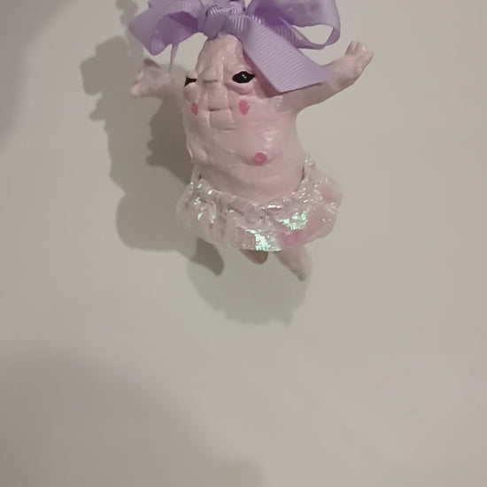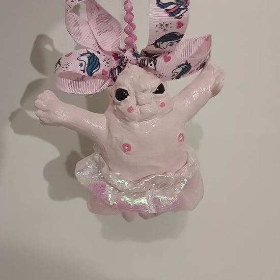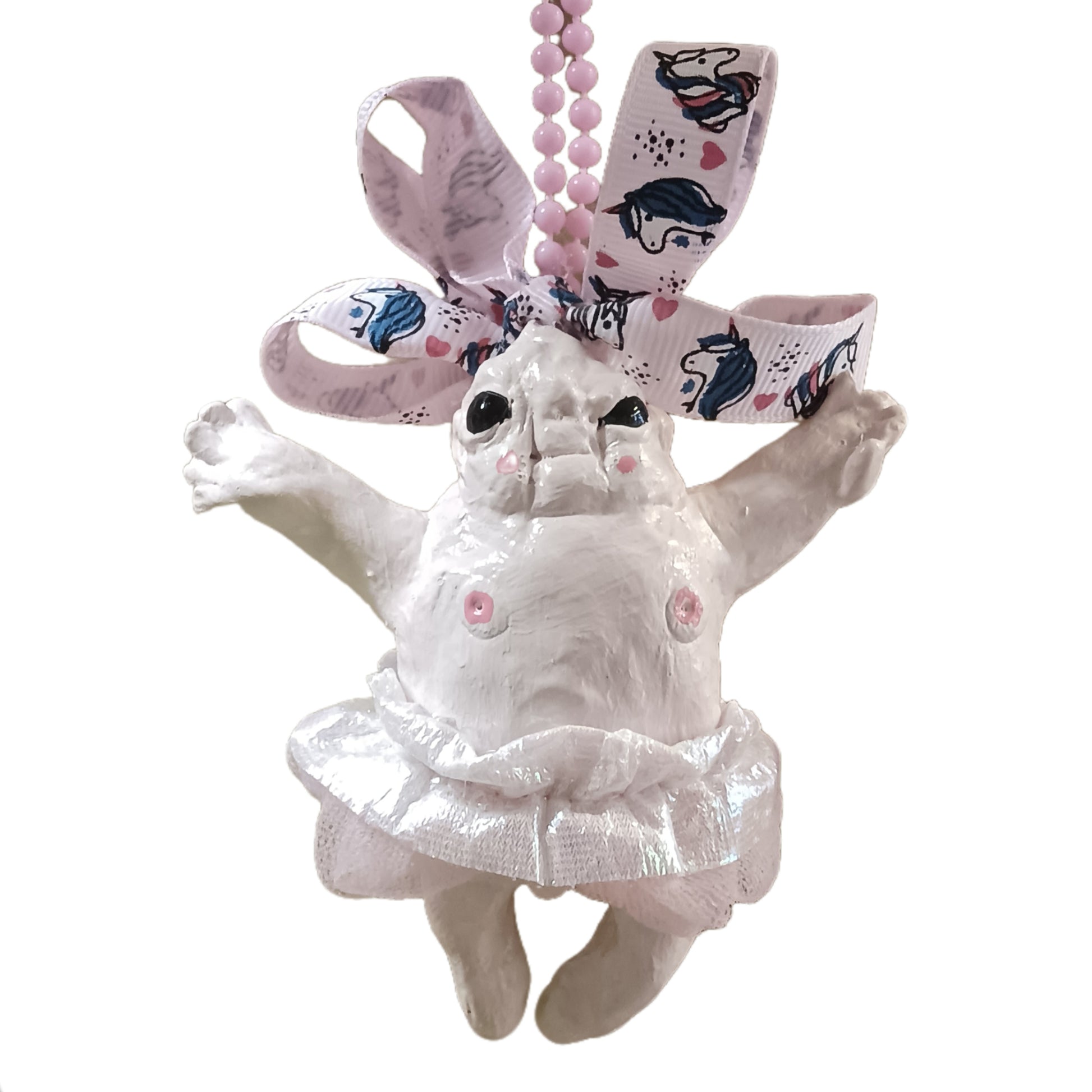Polymeerimassasta ja kierrätysmateriaaleista valmistettu uniikki ja hämmentävän suloinen hahmo, jolla hameen alla K-18-ylläri.