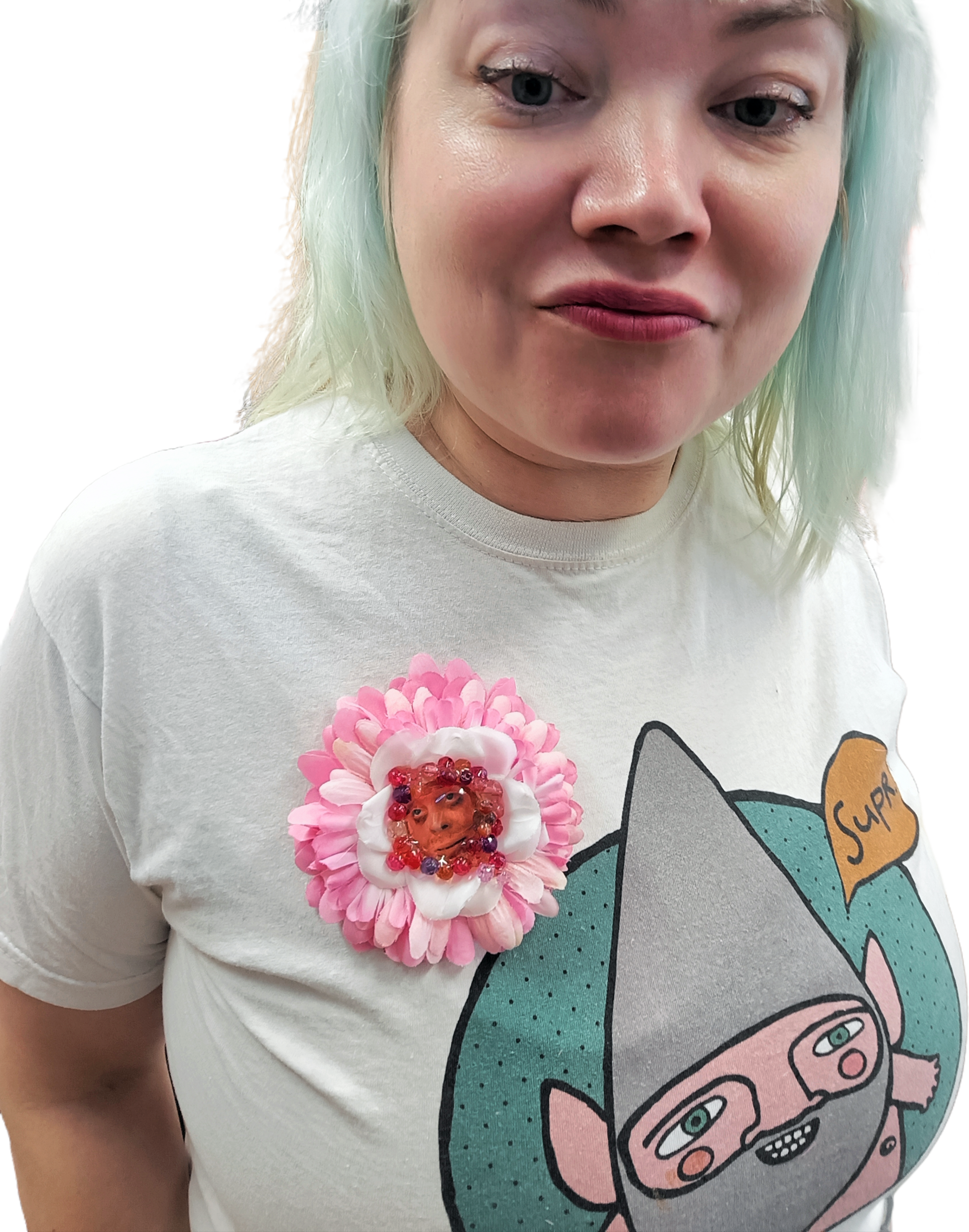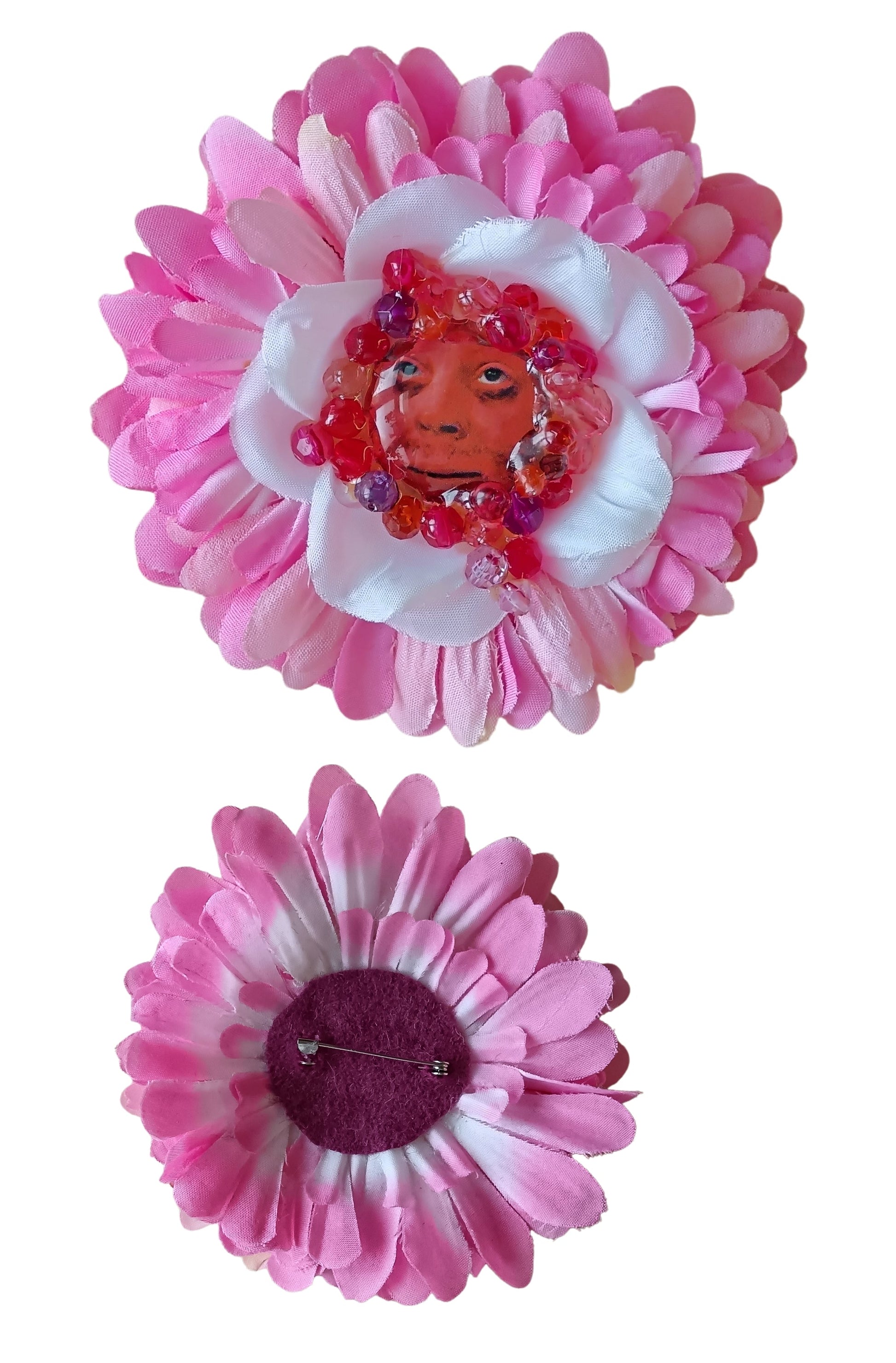 Hauska ja näyttävä statement rintakoru, joka on valmistettu pääosin kierrätysmateriaaleista. Silkkikukan keskellä on kapussilasilla päällystetty Uuno Turhapuro-hahmon kuva. Kuva on Vesa-Matti Loirin cd-levyn kansilehdestä kierrätetty. Kuvan ympärillä uv-hartsilla päällystettyjä lasi- ja muovihelmiä. Tukeva neulakiinnitys takana.